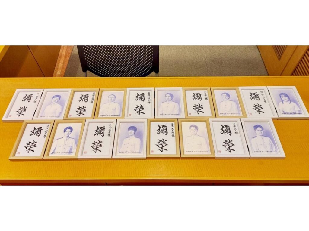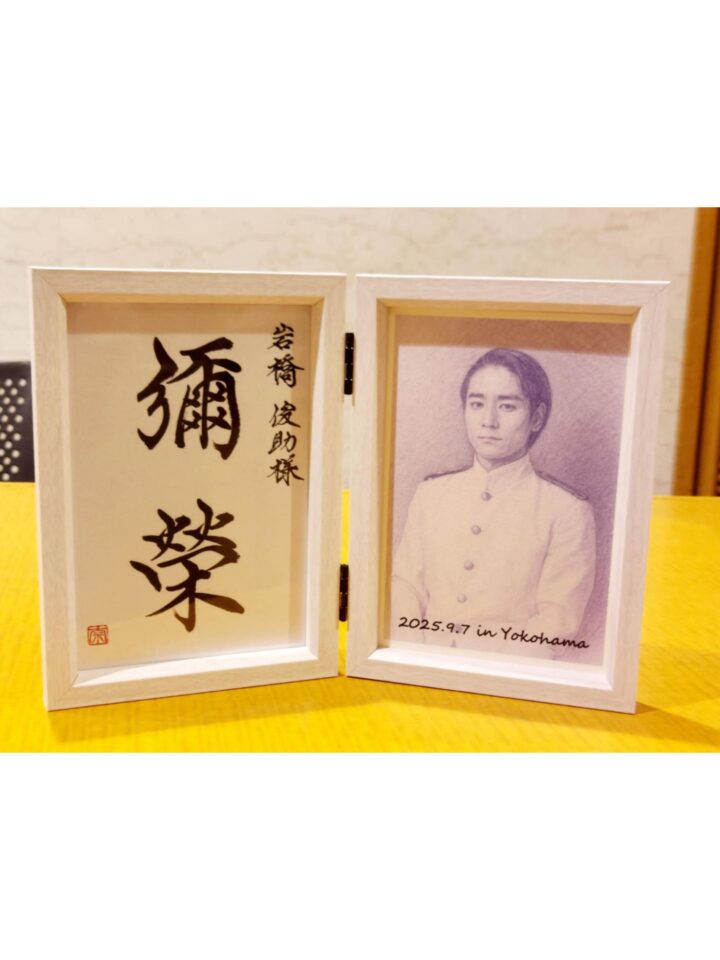 舞台『流れる雲よ』が、そして演者の皆さんの俳優人生がますます弥栄であることを願い、魂を込めて揮毫した奈津のオリジナル書作品【あなたへのメッセージ】~特別バージョン~。似顔絵入りということもあり、今年も9名の演者の皆さん全員が喜んでくださいました。