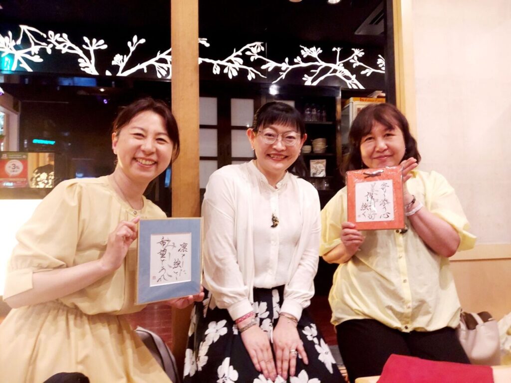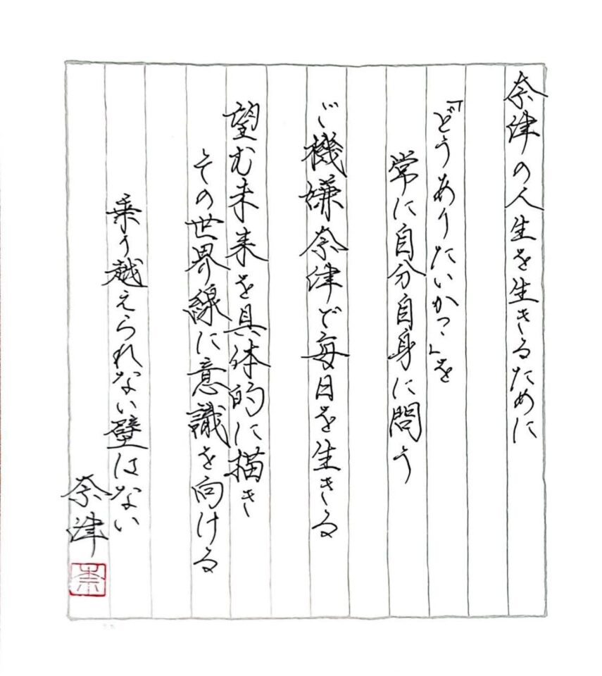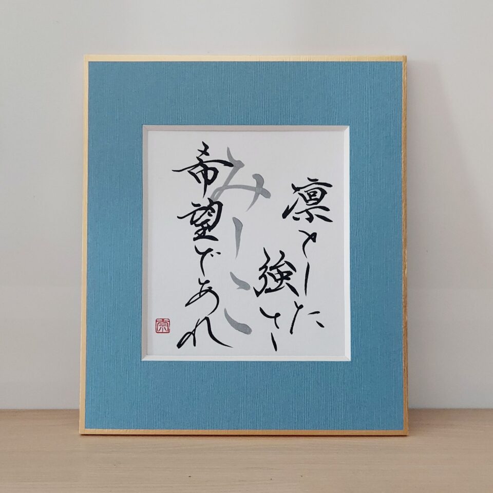 奈津が学ぶスクール「集合意識覚醒プログラムMAGATAMA」でいつも温かく見守り寄り添ってくださる先生方に感謝の気持ちを込めて、書作品をお贈りしました。先生のお好きな色をフレームに選びました。想いをことばにし、書で表現することは本当に楽しく幸せな時間です。奈津の書を喜んでいただけて、とても嬉しかったです。